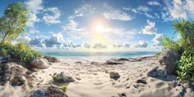 A picturesque tropical paradise with pristine white sand beaches, swaying palm trees, and a crystal-clear turquoise ocean under a vibrant blue sky