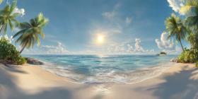 A picturesque tropical paradise with pristine white sand beaches, swaying palm trees, and a crystal-clear turquoise ocean under a vibrant blue sky