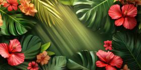 A vibrant tropical scene with lush green foliage, vibrant hibiscus flowers, and a warm, hazy atmosphere