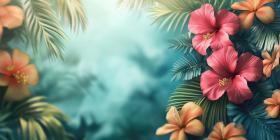 A vibrant tropical scene with lush green foliage, vibrant hibiscus flowers, and a warm, hazy atmosphere