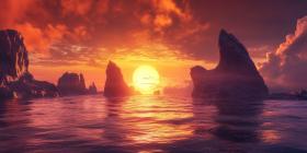 A breathtaking sunset paints the sky in fiery hues, casting a dramatic glow over a seascape dotted with dramatic cliffs and soaring sea stacks