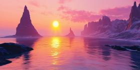 A breathtaking sunset paints the sky in fiery hues, casting a dramatic glow over a seascape dotted with dramatic cliffs and soaring sea stacks