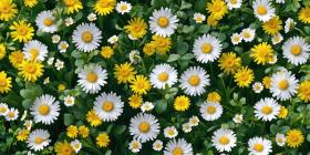 A vibrant field of daisies, with a cheerful mix of white and yellow blooms creating a cheerful and eye-catching display.