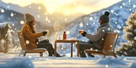 Two Individuals Enjoying Steaming Beverages Outdoors in a Serene Snowy Landscape with Snow-Covered Trees and Mountains at Sunset