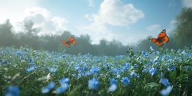 A magical scene of colorful butterflies fluttering amongst a field of delicate blue flowers bathed in warm sunlight