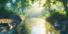 A serene waterfall cascades through a lush, vibrant jungle, creating a tranquil oasis of nature