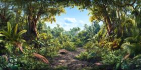 A sunlit path winds through a lush, vibrant jungle, leading the eye towards a hidden clearing