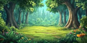 A sunlit clearing in a vibrant enchanted forest, teeming with life and inviting exploration