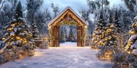 A magical winter wonderland awaits beyond a festive doorway adorned with twinkling lights and holiday greenery, nestled amidst a snow-covered forest