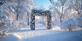 A magical winter wonderland awaits beyond a festive doorway adorned with twinkling lights and holiday greenery, nestled amidst a snow-covered forest