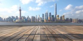 A wooden table overlooking a vibrant cityscape illuminated with dazzling lights at night, offering a sense of urban vibrancy and nightlife