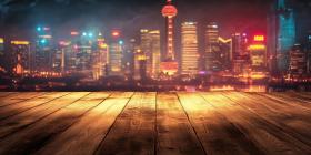 A wooden table overlooking a vibrant cityscape illuminated with dazzling lights at night, offering a sense of urban vibrancy and nightlife