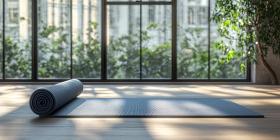 A rolled-up yoga mat rests on a hardwood floor, inviting a moment of tranquility in a sunlit room with large windows overlooking a cityscape