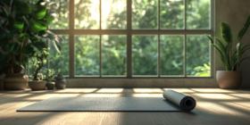 A rolled-up yoga mat rests on a hardwood floor, inviting a moment of tranquility in a sunlit room with large windows overlooking a cityscape