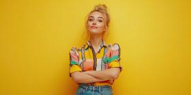 Vibrant Portrait of an Individual in a Colorful Patterned Shirt with Rolled-Up Sleeves and Blue Jeans Against a Bright Yellow Background