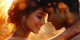 Two Individuals in Traditional Attire with Flower Garlands and Vibrant Bokeh Lights Celebrating a Festive Occasion