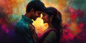 Two Individuals in Traditional Attire with Flower Garlands and Vibrant Bokeh Lights Celebrating a Festive Occasion