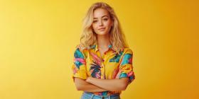 Vibrant Portrait of an Individual in a Colorful Patterned Shirt with Rolled-Up Sleeves and Blue Jeans Against a Bright Yellow Background