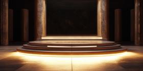 Stage of Mystery: A circular platform bathed in warm light, set against a backdrop of textured darkness, invites contemplation and discovery