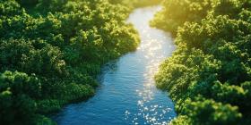 River of Sunlight: A sun-dappled river winds through a lush green forest, casting shimmering reflections on the water's surface