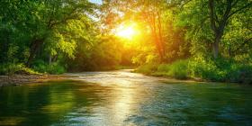 River of Sunlight: A sun-dappled river winds through a lush green forest, casting shimmering reflections on the water's surface