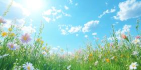 Spring Awakening: A field of delicate blossoms reaches towards a sun-drenched sky, a vibrant display of nature's renewal