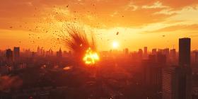 Apocalyptic Horizon: A fiery explosion engulfs a cityscape, casting an ominous shadow over the cityscape in a scene of unimaginable destruction