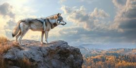 Guardian of the Peaks: A lone wolf stands watch on a rocky precipice, surveying its domain with a keen gaze and a sense of timeless wisdom