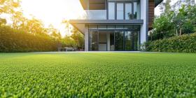 Lush Green Oasis: A modern home with expansive windows overlooks a meticulously manicured lawn, creating a picture of serene luxury and outdoor living