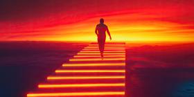 Silhouette of a Runner Ascending Glowing Stairs Against a Mesmerizing Sunset Sky