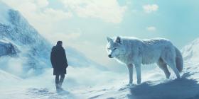 Mystical Encounter: Cloaked Figure and White Wolf on Snowy Mountain Outcrop