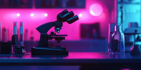 Neon Lab: A futuristic workspace bathed in vibrant hues, where a robotic hand reaches towards a glowing microscope, hinting at cutting-edge scientific discoveries