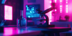 Neon Lab: A futuristic workspace bathed in vibrant hues, where a robotic hand reaches towards a glowing microscope, hinting at cutting-edge scientific discoveries