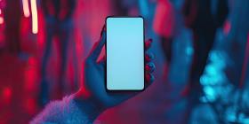 Neon Nights: A hand holds a smartphone with a blank screen, capturing the vibrant glow of a neon-lit cityscape, a beacon in the digital age