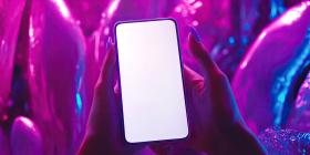 Neon Nights: A hand holds a smartphone with a blank screen, capturing the vibrant glow of a neon-lit cityscape, a beacon in the digital age