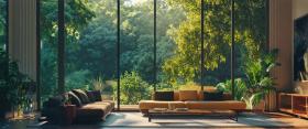 Nature's Embrace: A living room bathed in natural light, with floor-to-ceiling windows framing a breathtaking view of a lush green forest