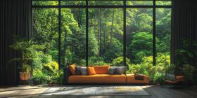 Nature's Embrace: A living room bathed in natural light, with floor-to-ceiling windows framing a breathtaking view of a lush green forest