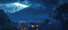 Volcanic Fury: A dramatic eruption illuminates the night sky, as molten lava flows down the slopes of a towering volcano, a breathtaking display of nature's raw power