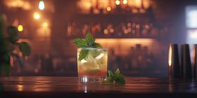 Neon Nights: A refreshing cocktail, garnished with mint, sits illuminated on a bar counter, promising a cool and invigorating escape from the summer heat