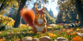 Autumnal Feast: A fluffy red squirrel sits amidst a bed of fallen leaves, savoring a tasty nut, a picture of contentment in the heart of autumn.
