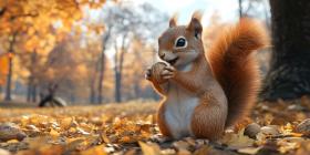 Autumnal Feast: A fluffy red squirrel sits amidst a bed of fallen leaves, savoring a tasty nut, a picture of contentment in the heart of autumn.