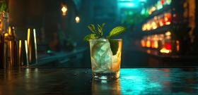 Neon Nights: A refreshing cocktail, garnished with mint, sits illuminated on a bar counter, promising a cool and invigorating escape from the summer heat