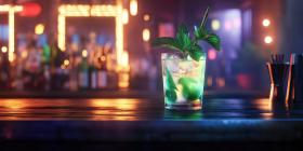 Neon Nights: A refreshing cocktail, garnished with mint, sits illuminated on a bar counter, promising a cool and invigorating escape from the summer heat