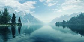 A Red Canoe Dreams of Adventure on a Tranquil Lake, Snow-Capped Peaks Standing Guard