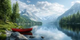 A Red Canoe Dreams of Adventure on a Tranquil Lake, Snow-Capped Peaks Standing Guard