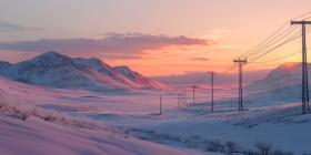 Where Power Lines Trace a Path Through a Crimson Sky, a Winter Landscape Awaits