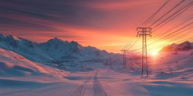 Where Power Lines Trace a Path Through a Crimson Sky, a Winter Landscape Awaits