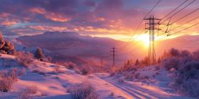 Where Power Lines Trace a Path Through a Crimson Sky, a Winter Landscape Awaits
