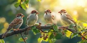 Feathered Friends: A group of sparrows perches on a branch, bathed in the warm glow of the morning sun, creating a scene of tranquil beauty