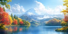 A picturesque landscape featuring a serene lake reflecting a vibrant mountain range, adorned with trees in full bloom of spring, summer, and autumn